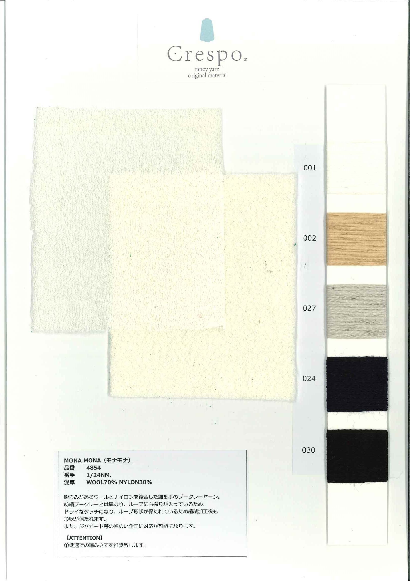 MONA MONA 是一种细支圈圈呢纱线,结合了蓬松羊毛和尼龙。与纺成的毛圈布不同,毛圈也被扭曲,使其具有更干燥的触感,并且毛圈在填充过程后仍保持其形状。此外,还可以应对提花等广泛的项目。